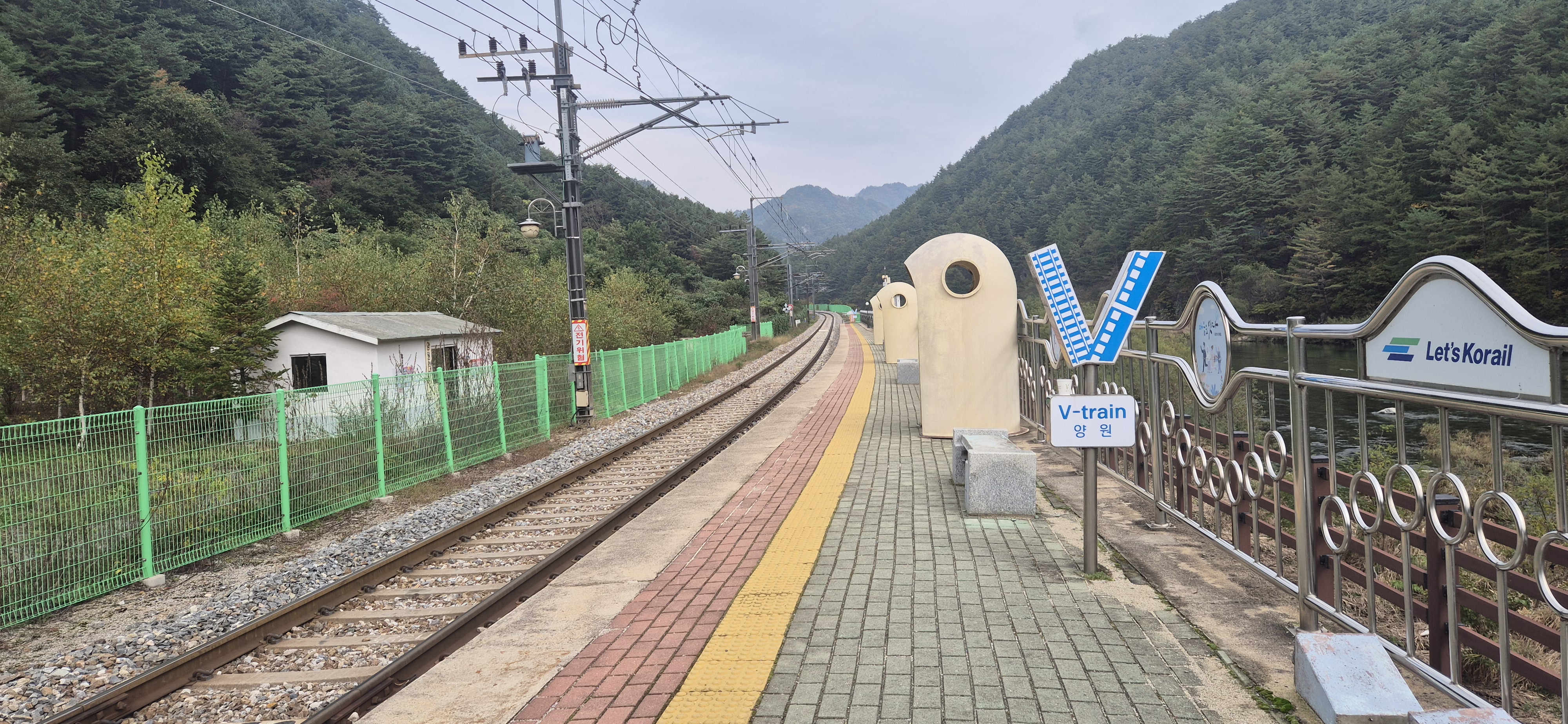이곳은 승부역과 양원역 사이 유일하게 사람들의 앉아 쉴 수 있는 쉼터다. 몇개의 평상이 준비되어 있으나 낙엽들이 쌓여 있어 누군가 가져다 놓은 빗자루로 쓱쓱 털어내고 앉으면 된다.